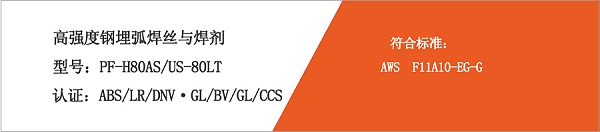 【产品特性】低温规格780MPa级钢用。-80℃的冲击性优良。PF-H80AS为低扩散氢型,耐裂纹性优良、适合厚板焊接。