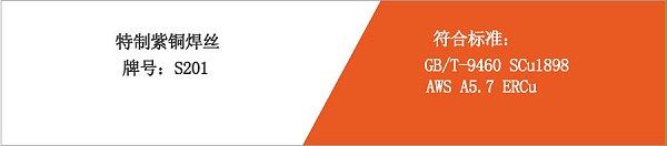 产品特性:S201是含有锡、硅、锰、磷等微量元素的脱氧铜焊丝,硅、锰、磷主要是作为脱氧剂加入,而锡加入则改善了熔融铜的流动性,焊接紫铜时具有焊接工艺性能优良,焊缝成型良好,机械性能高等优点。